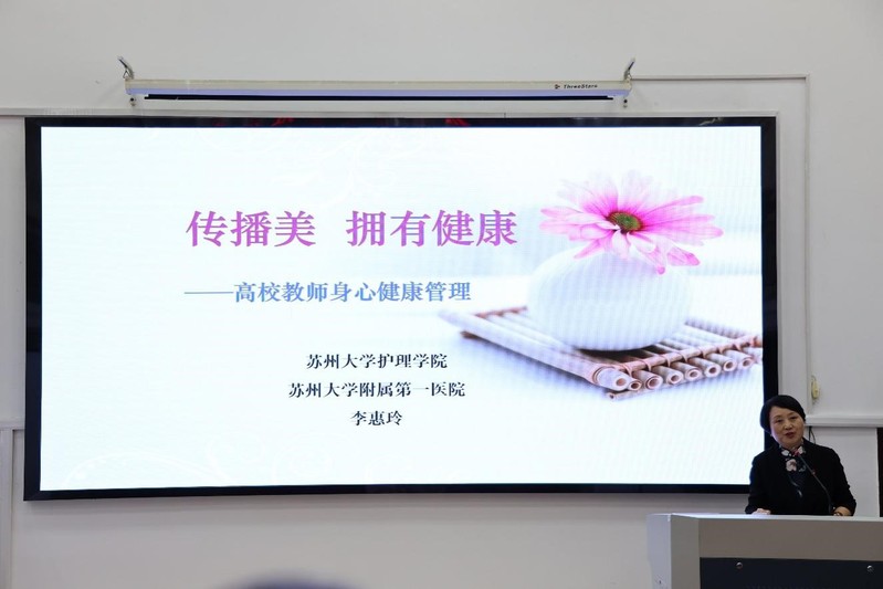李惠玲作题为“传播美,拥有健康——高校教师身心健康管理”的健康讲座,针对高校教师面临的六大健康问题:讲--慢性咽炎声音嘶哑、写--长期伏案肩颈疼痛、站--静脉曲张脚腿肿胀、吸--慢性咳嗽支气管炎、吃--胃肠道功能紊乱、堵--心理障碍悄然降临等方面进行健康管理知识宣教,通过具体案例,深入浅出地讲解如何做好个人健康管理,保持身心健康,感受美好生活。