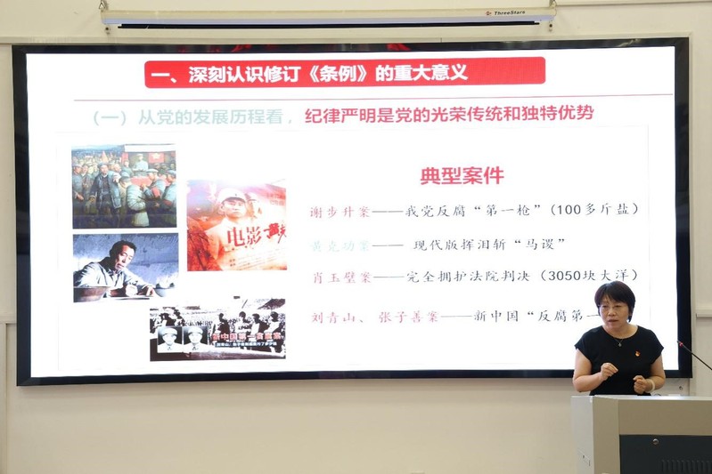 朱蓉蓉以“加强党的纪律建设,全面推进从严治党—《中国共产党纪律处分条例》解读”为题,围绕“深刻认识修订《条例》的重大意义”“准确把握新修订《条例》的主要内容”“认真贯彻新修订《条例》的基本要求”三个方面讲授专题党课。结合医药反腐行动、打“虎”行动等实际案例,深化广大师生党员对党规党纪的理解,真正做到把遵规守纪刻印于心,外化为言行准则。